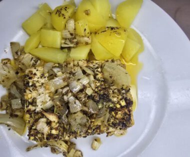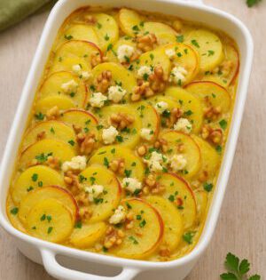 Veganer Apfel-Kartoffelauflauf mit Schafskäse